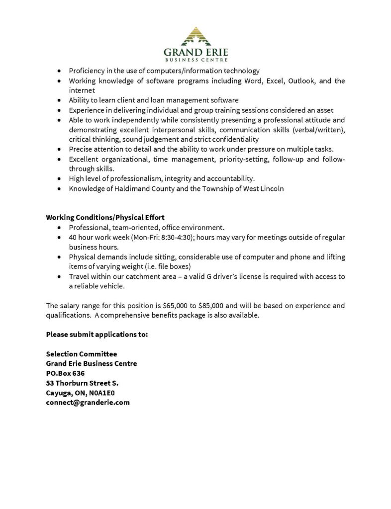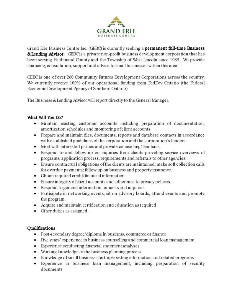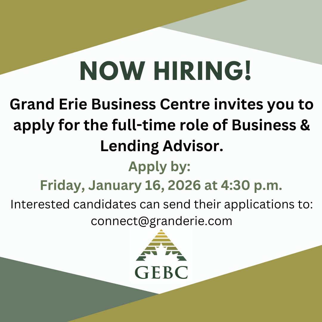 Grand Erie Business Centre is currently looking for a full-time Business & Lending Advisor to join our team. Please see the full details below and apply as indicated.